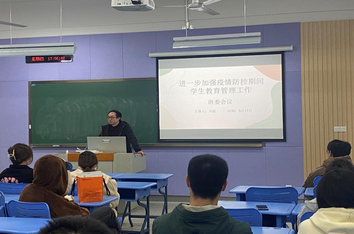 根据学校《关于进一步加强校园疫情防控工作的通知》《关于进一步加强校园疫情防控期间学生教育管理工作的通知》等文件精神,为进一步做好校园疫情防控期间学生教育管理工作,江南平台_江南(中国)于2022年3月17日下午在教2-304教室召开主题班委会议。本次会议由刘磊老师主持,各班班长、团支书、学习委员代表参加了会议。
