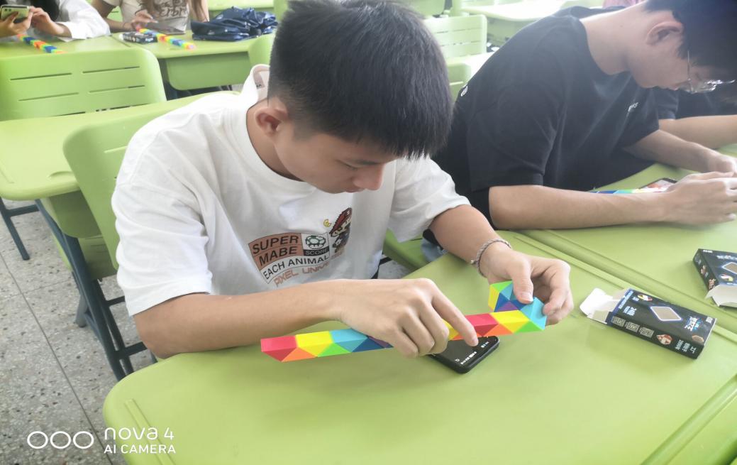 环节一:千奇百怪,动手能力。本环节类似于魔尺比赛,可以激发同学们对立体造形的想象力和创造力。做模型的过程中就是一个磨练智力和耐心的体验,从而提高同学们的观察力、想象力和分析能力。把魔尺分发给各位同学后,根据辅助视频用魔尺依次完成了立体爱心、皇冠、乌篷船、球等图形。活动中展示了同学们较强的动手能力,活跃了现场氛围。