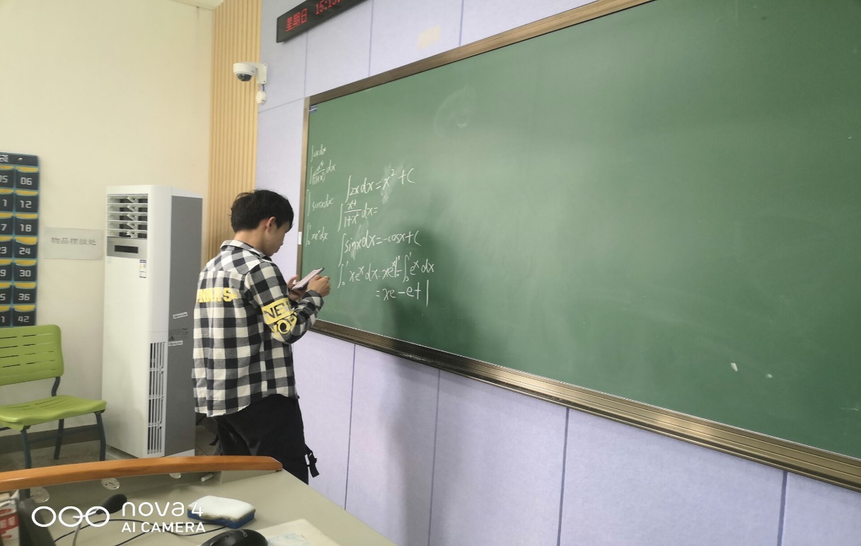 环节二:头脑风暴,数学解题。同学分小组自行组队,2到4人为一组,在规定时间内完成黑板上所写的题目,正确率高的队伍获胜,这个环节题目主要涉及了“经济数学基础”课程中微积分模块的知识点,微积分在数学中的重要性很突出,也是同学平常学习的难点。这一环节中现场讨论热烈,竞争也比较激烈,推动了现场活动达到高潮。