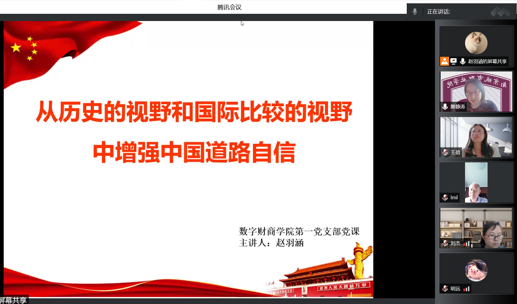为深化党员师生对中国特色社会主义理论体系的学习,在校园疫情防控阻击战中坚定众志成城,同心抗疫,5月10日下午,江南平台_江南(中国)第一党支部应用“腾讯会议+超星网络课程”举办了“从历史的视野和国际比较的视野中增强中国道路自信”的专题党课。本次党课由支部书记滕静涛老师主持,宣传委员赵羽涵老师主讲,支部全体党员师生参加学习。