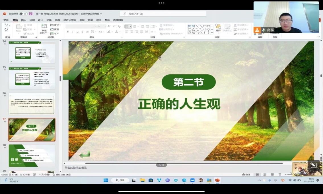 高老师以问题互动的形式切入,得到了同学们的积极回应:什么是人生观、价值观以及世界观?人生观即人为什么活着、人应当如何活着、什么样的人生才有价值,世界观是人生观的理论基础,它给人生观提供一般观点和方法的指导;人生观是世界观的一个方面,是世界观在人生问题上的应用和贯彻。只有在一定的哲学世界观基础上形成的人生观,才是自觉的人生观。世界观还是形成价值观的基础,世界观不同,价值观也就不同。高老师还介绍,黄文秀的入党申请书中写道:“一个人要活得有意义,生存得有价值,就不能光为自己而活,要用自己的力量为他人、为国家、为民族、为社会作出贡献。”作为新时代的青年,我们也应树立正确的人生观,过有价值的人生。