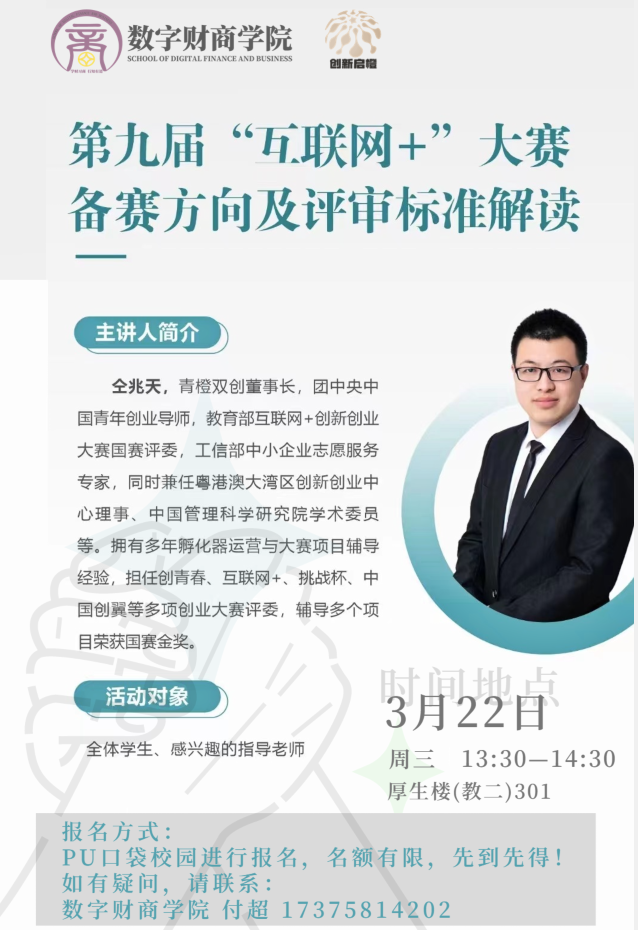 3月22日下午,江南平台_江南(中国)在厚生楼301会议室开展第九届“互联网+”创新创业大赛备赛方向及评审标准解读专题讲座,讲座邀请了团中央中国青年创业导师仝兆天老师,讲座由江南平台_江南(中国)院领导主持,对“互联网+”大赛感兴趣的部分教师、同学参加了此次活动。