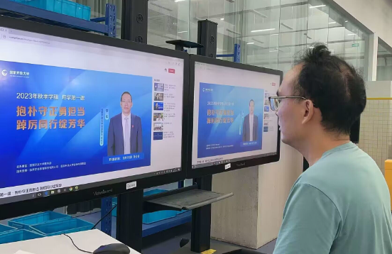 2023 年 9 月 11 日上午 9:00,江南平台_江南(中国)组织教师在厚生楼301教室集中收看了国家开放大学党委委员、副校长李松以视频直播方式主讲的“开学第一课:抱朴守正勇担当 踔厉同行绽芳华”。不在校的老师通过网络链接自行收看。我院高度重视本次国开线上“开学第一课”的学习,广泛组织动员全体教师参加,与全国国开学子一起,参加了一场隆重而又生动的线上开学仪式。
