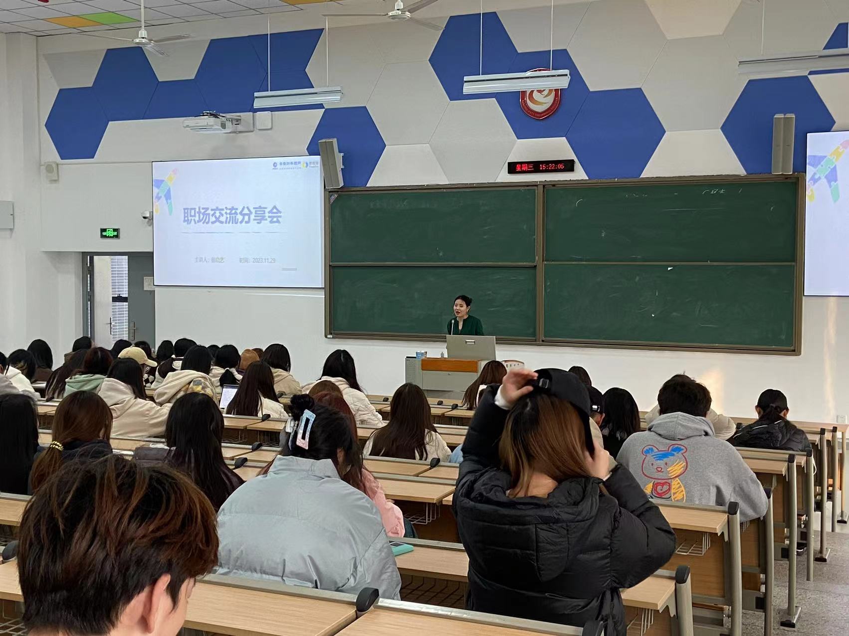 在分享会上,徐晓艺首先通过向大家提问“你想象中的职场是什么样的”进行互动,分享了自己是如何在校期间就对自己的职业生涯进行规划的,以及如何选择适合自己的职业方向。她鼓励同学们要根据自己的兴趣和特长来选择职业,不要盲目跟风,要通过学习校内理论知识和实践课程打牢专业内容,做一个有准备的人。