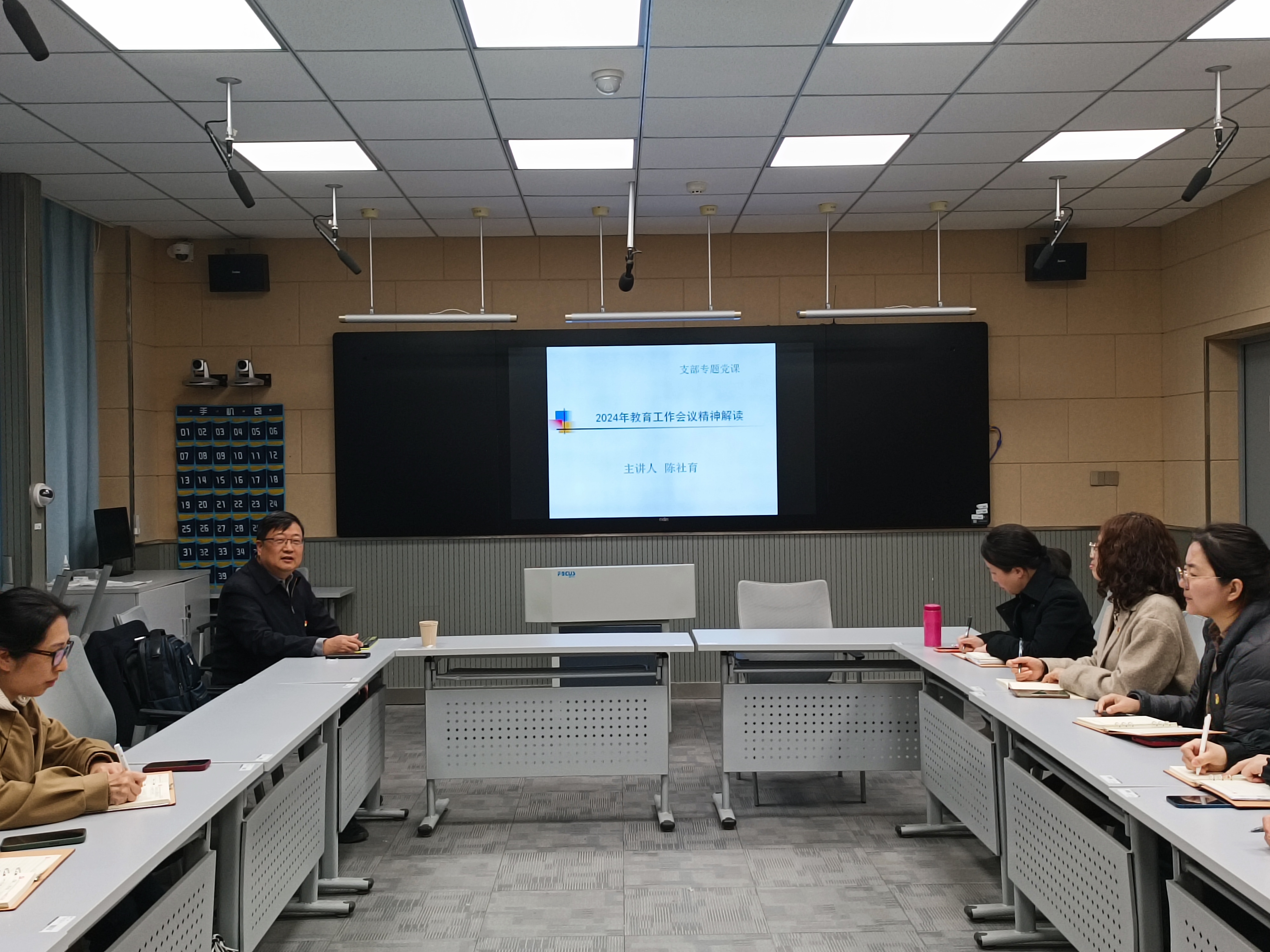 活动开始后,支部书记滕静涛首先介绍了本次活动的目的并布置了2024年支部工作计划。随后,陈社育教授开始本次“2024年教育工作会议精神解读”的专题党课讲授,讲授内容分别从全国教育工作会议精神、江苏省教育工作会议精神两个方面详细展开。根据全国教育工作会议内容,陈教授首先总结强调了2024年总体工作目标是坚持稳中求进,然后对会议内容中如何把握好教育的“三个属性”、如何理解教育工作的“七项工作要点”及如何做好教育工作的“四点工作要求”进行了详细阐释。根据江苏省教育工作会议内容,陈教授随后又从把握根本保证、回答根本问题、坚持根本追求、扛起根本使命和筑牢根本保障五个方面向全体党员解读了2024年江苏教育系统重点部署工作,并结合我院实际对如何将两级教育工作会议精神落实到全体党员的工作和学习中进行了简要交流。