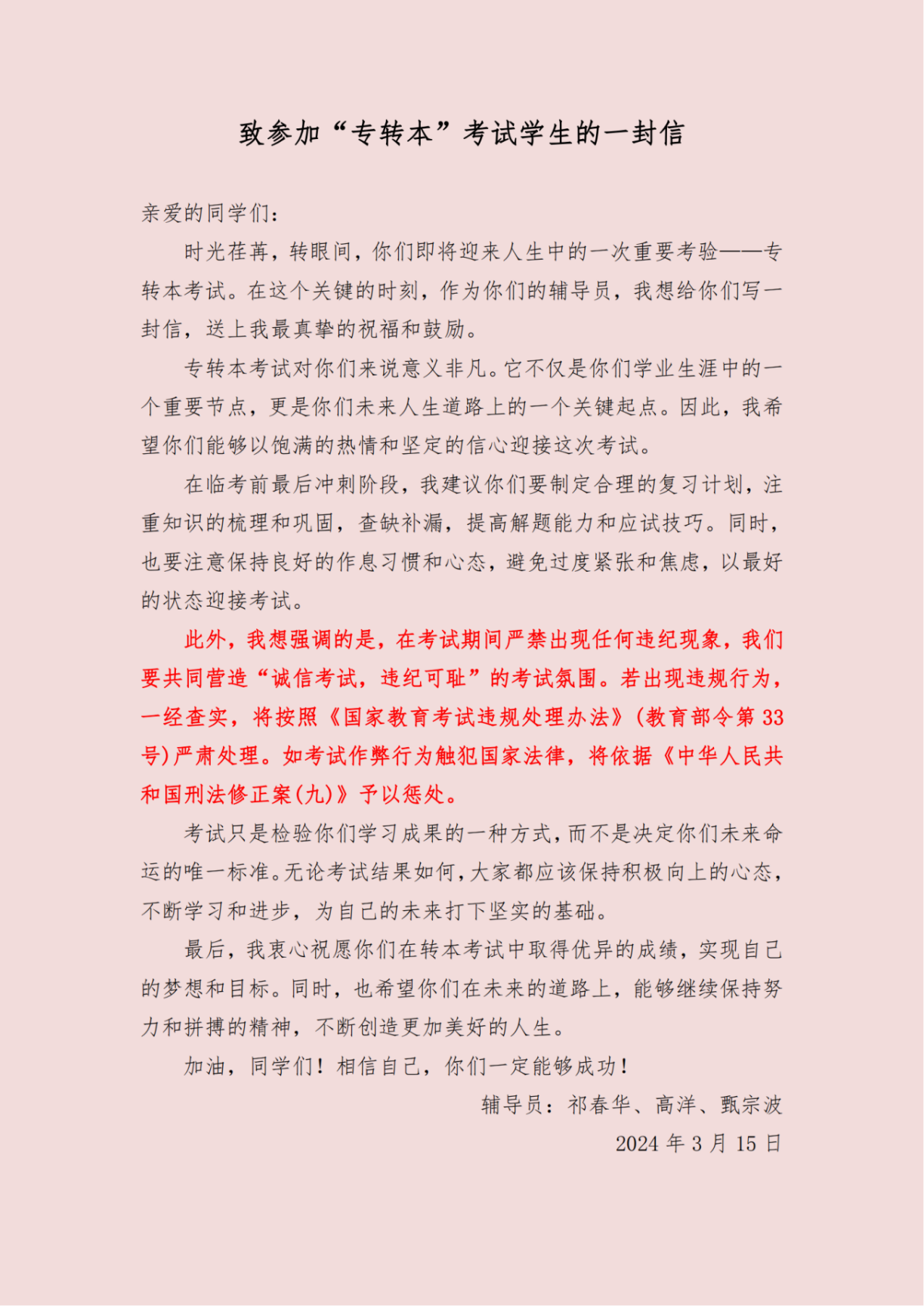 随后,辅导员们对考生们提出了几点建议和期望。信中强调,在备考过程中,考生们要注重知识的积累与运用,做到学以致用;同时,要合理安排时间,保持良好的作息习惯,确保身心健康;此外,还强调要严格遵守考试纪律,共同营造“诚信考试,违纪可耻”的考试氛围。