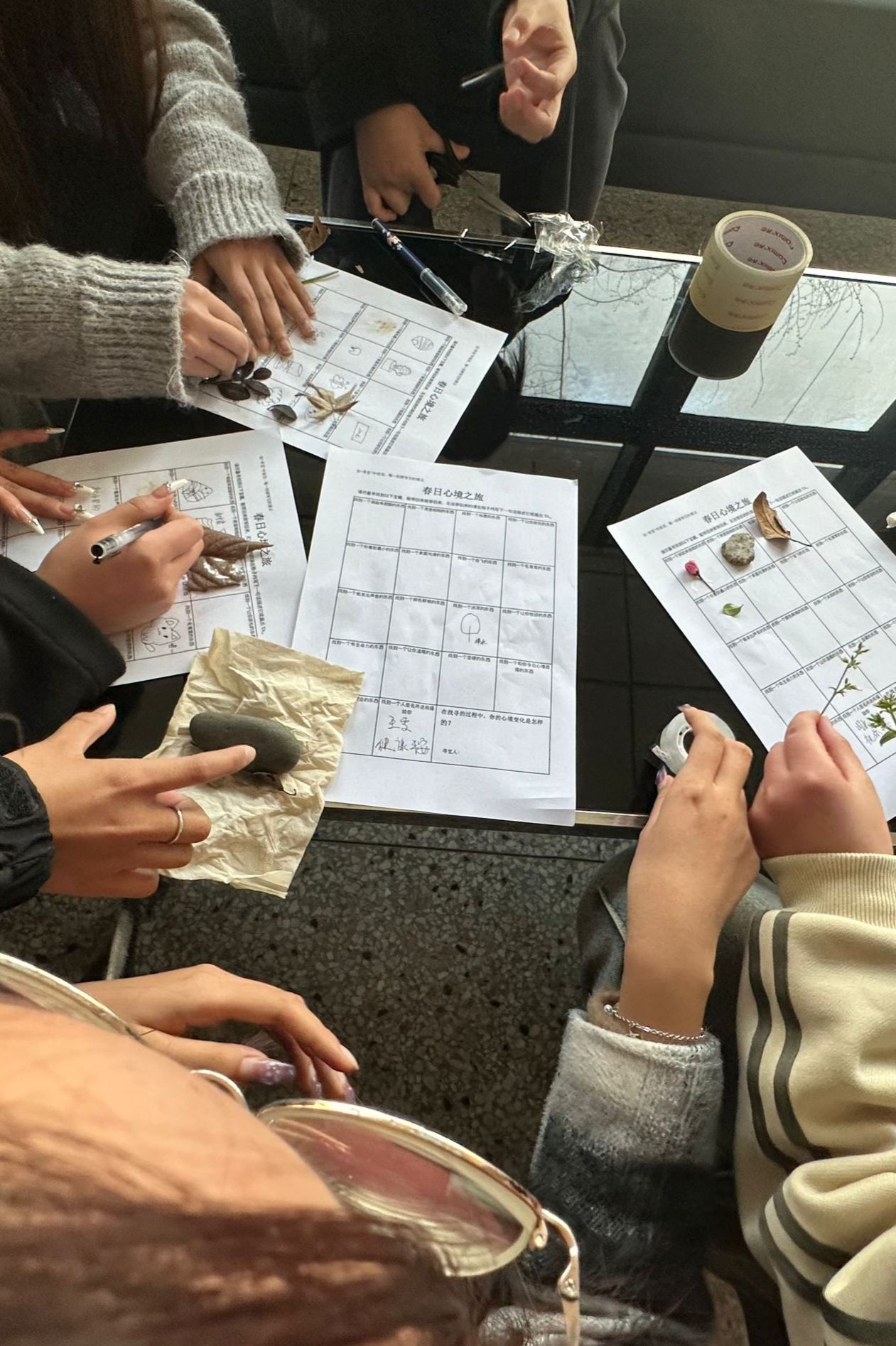 2024年3月20日,此次活动在厚生楼心理工作站开展。活动开展初期,每位参与者将从心理工作站的工作人员手中领取一份“情绪感知表”和签字笔,根据表格中描述的要素及特点,找寻校园中符合描述的物体。完成“感知表”的同学可以寻找一位陌生人给予祝福,最后将祝福写在风铃上,共享给其他同学。通过找寻过程,清晰各种描述所呈现出的多样性特征,从而引导学生采取多角度看待同一事务的能力。如“找到一个温暖的物体”“找到一个有生命力的东西”等描述给学生带来积极向上、乐观正向的心理引导。