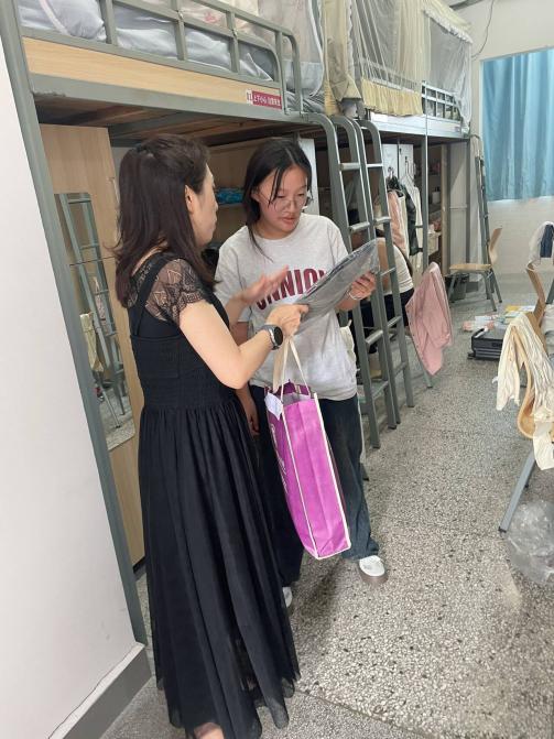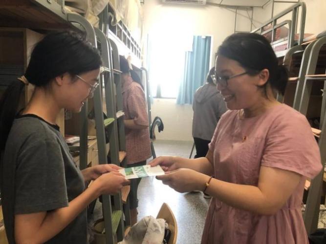 走访前,支部书记滕静涛细致地分配好每一位党员老师走访的宿舍号,祁春华、高洋、甄宗波三位辅导员提前把走访宿舍时发放给学生的T恤及宣传册分装好,并在袋子上细心标记好一间宿舍每一名学生的姓名、尺码。中午12:30,党员老师们来到学生宿舍发放T恤、宣传册,并与新生亲切交流,询问他们对校园生活有什么疑惑与困难,给予相应的指导。看着18、19岁的学生们楼上楼下奔忙着,满怀喜悦地憧憬即将到来的大学生活,老师们汗水淌在背上,笑容溢在脸上,都说今天教师节过得真有意义。当天,支部党员教师共计走访67个宿舍,看望近400名小萌新。希望通过党员教师的走访活动,帮助我院新生更好地适应大学生活,促进学生全面发展与健康成长。
