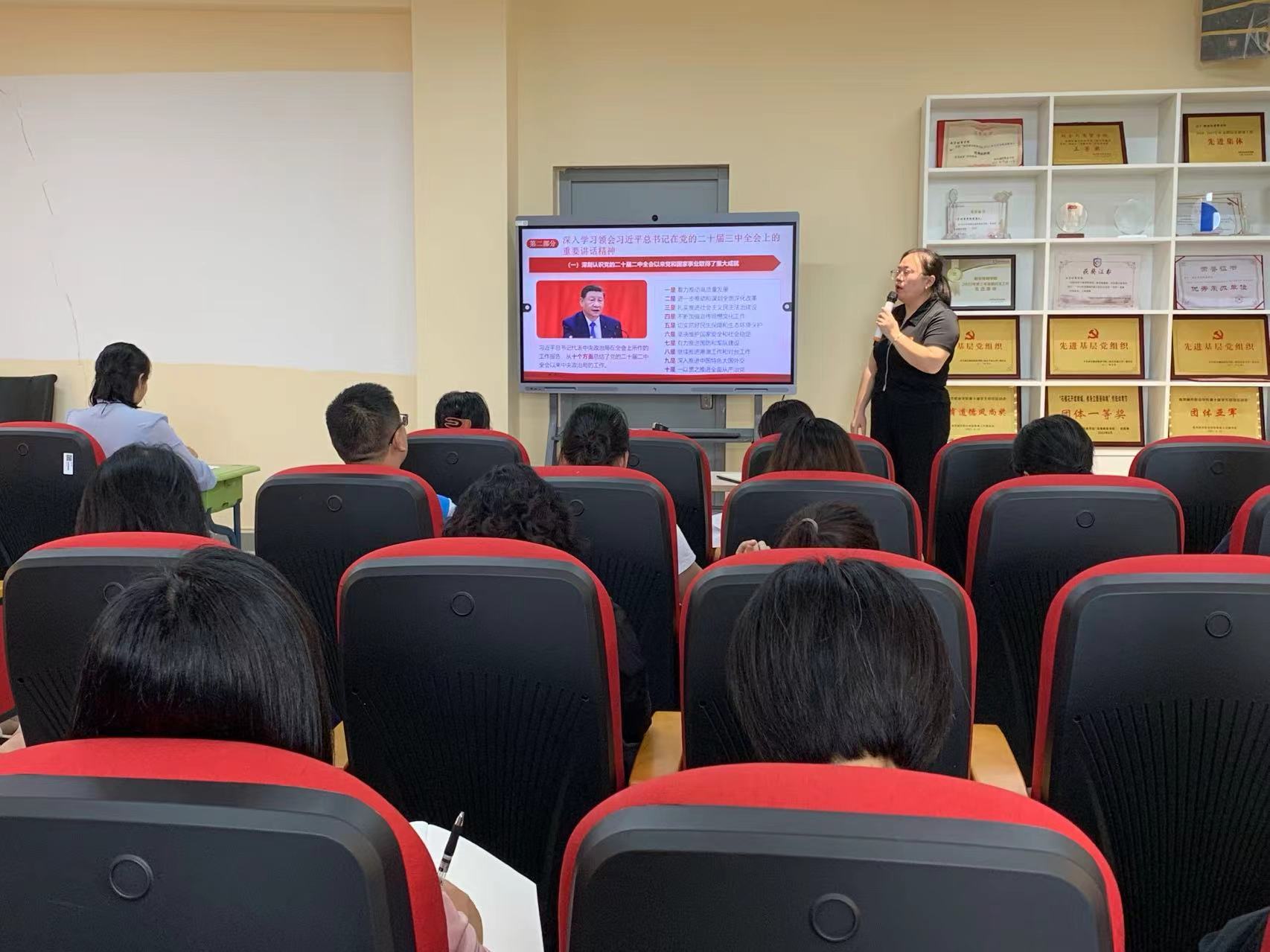 为深入学习宣传贯彻落实党的二十届三中全会精神,进一步统一思想、凝聚共识,江南平台_江南(中国)党总支于9月24日下午在厚生楼301室举办学习贯彻党的二十届三中全会精神宣讲会。此次宣讲会特邀校宣讲团成员、马克思主义学院刘晨老师担任主讲人,学院党总支全体党员和师生代表60余人参加会议。宣讲会由学院党总支副书记、副院长刘晓艳主持。