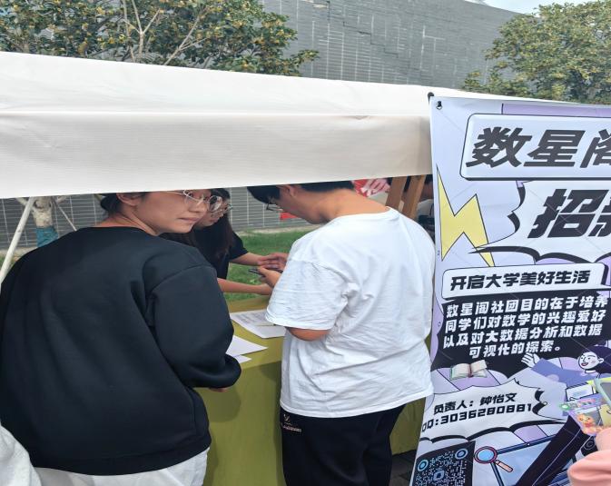 “数星阁”作为学生社团,一直致力于搭建一个集学习交流、技术创新、实践探索于一体的平台,通过系列讲座、工作坊、项目竞赛等形式,激发学生的创新思维,提升其解决实际问题的能力。走在“数星阁”招新处的前面,彩色凉棚下是社团成员热情的笑容,放眼望去,人流涌动,社团社长钟怡文同学为感兴趣的同学一一进行相关介绍。本次社团招新活动,不仅为社团注入了新鲜血液,更为同学们提供了丰富多彩的生活以及一个学习兴趣爱好的机会。除此之外,这也是一个寻找志同道合朋友的一个良好平台,同学们可以在提高自己的同时做自己感兴趣的事。