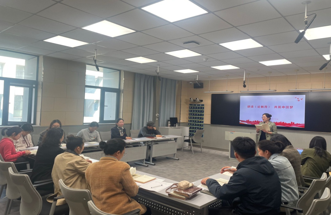 接着,由支部支委委员带领大家从内容简介、主要篇目、具体篇目三个维度对《论教育》进行全面深入的研读。在深入研读具体篇目的环节,汪洋、张淑静、袁哲茜等同志重点讲解了《论教育》中《在实现中国梦的生动实践中放飞青春梦想》《大力弘扬教育家精神,为党育人为国育才》《教师要成为塑造学生品格品行品味的大先生》等文稿,参会的同志也积极分享了自己的学习感悟。
