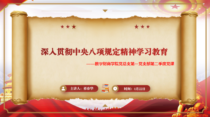 4月22日下午,江南平台_江南(中国)党总支第一党支部在厚生楼303教室举行了第二季度专题党课。本次党课由支部组织委员祁春华老师主讲,主题为“深入贯彻中央八项规定精神学习教育”,支部党员参加了学习。