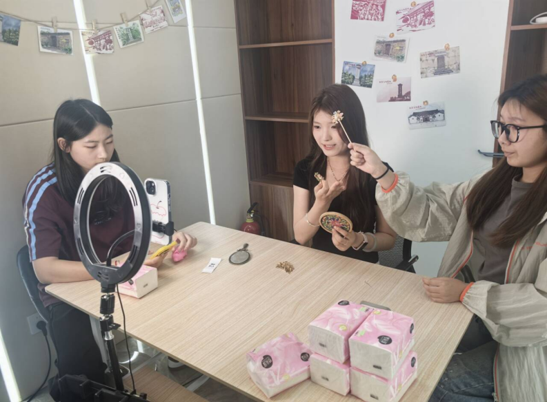 比赛现场,各直播间内气氛热烈,主播们以饱满的热情和专业的态度,向观众展示了一件件精美的非遗产品。从色彩绚丽、图案精美的掐丝珐琅杯垫,到工艺精湛、栩栩如生的虎头鞋,每一件作品都承载着深厚的文化底蕴和匠人的心血。主播们不仅详细讲解了产品的制作工艺和文化内涵,还熟练运用直播热词,与观众进行互动,有效调动了直播间的氛围,展现了青年学子对非遗文化的热爱与传承的决心。