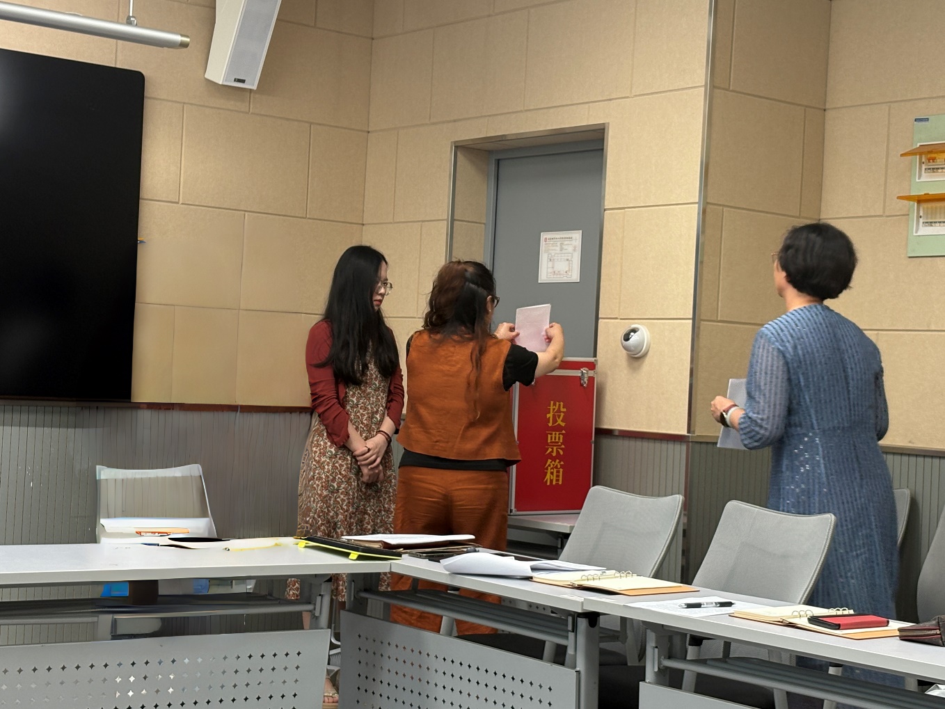 选举环节中,现场气氛庄重严肃。监票人首先检查投票箱并展示选票,向全体党员说明填写规范。全体党员秉持高度负责的态度,按照“无记名投票、差额选举”原则,慎重填写选票并依次投下选票。计票人在监票人全程监督下,严格核对选票数量、统计得票结果,当场公布选举结果。经现场计票,潘蓓、景姗娜两名同志以高票当选为第二党支部新一届支部委员会委员。