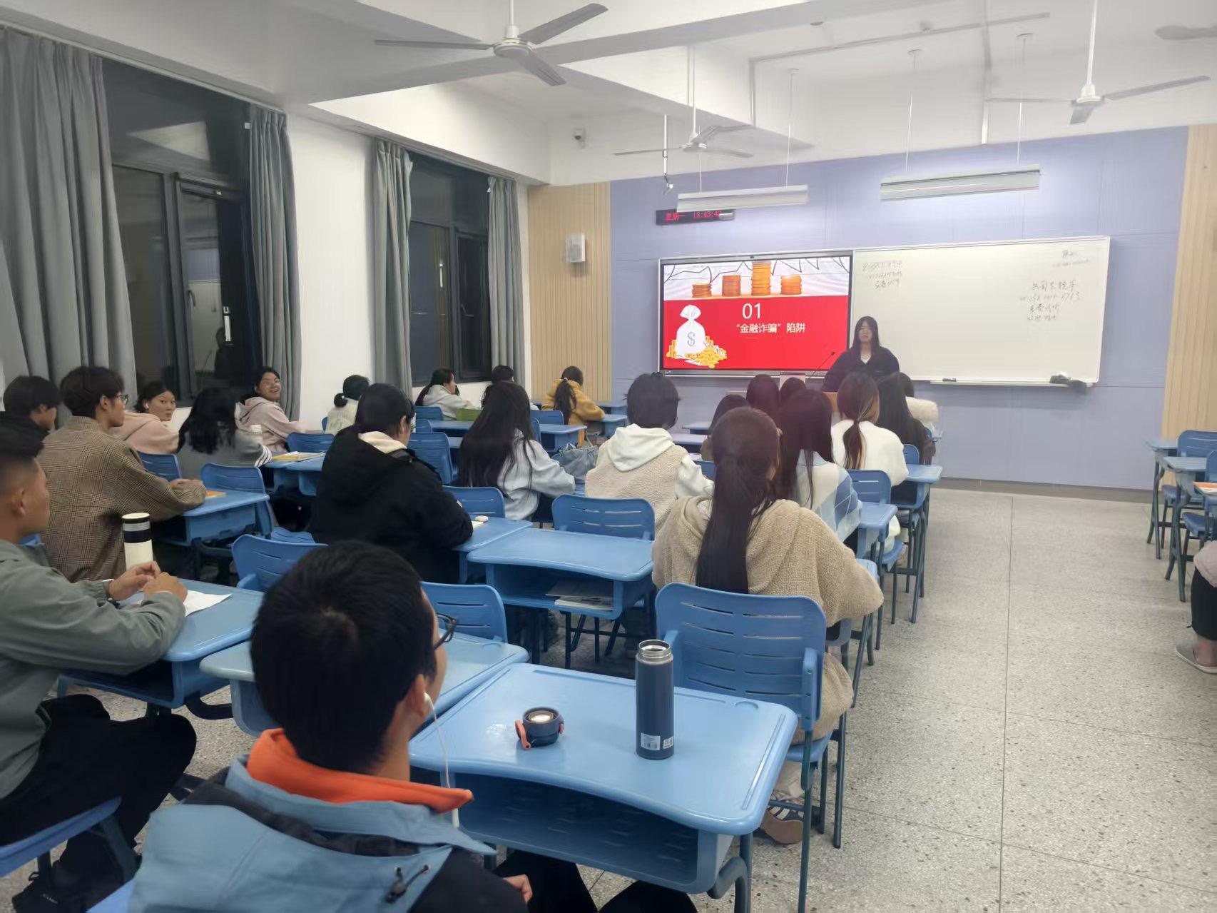本次宣讲由经过系统培训的大二反诈志愿者主讲。他们围绕“金融诈骗陷阱”“金融诈骗危害”“如何识别金融诈骗”及“你上当了吗”四个板块,结合“网贷陷阱”“云养牛非法集资”“养老保健骗局”等真实案例,生动剖析了常见诈骗手法,揭示了其对社会和家庭的严重危害。